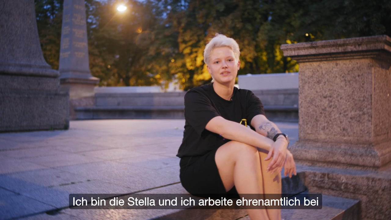 Samstagabend in der Stadt. Viele junge Leute sind unterwegs. Manche davon brauchen Unterstützung - zum Handyladen. Zum Quatschen. Oder eine kurze Pause, einen Rückzugsort. Stella ist da. Sie kennt solche Situationen aus der Zeit, in der sie selbst viel unterwegs war. Jetzt möchte sie einfach da sein, wenn jemand Hilfe braucht oder Fragen hat.