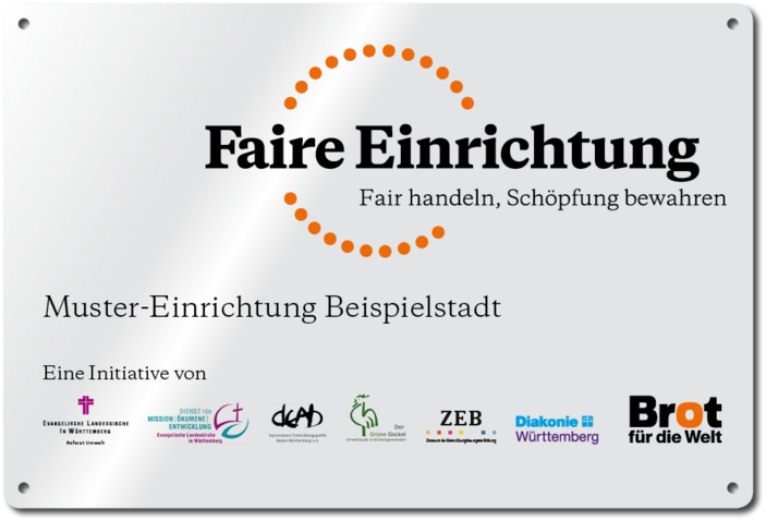 „Faire Einrichtung“ ist eine ökumenische Initiative von: Landesstelle Brot für die Welt im Diakonischen Werk Württemberg, Diözese Rottenburg-Stuttgart, Dachverband Entwicklungspolitik Baden-Württemberg e.V., Dienst für Mission, Ökumene und Entwicklung der Evangelischen Landeskirche in Württemberg, Referat Umwelt im Evangelischen Oberkirchenrat Stuttgart / Geschäftsstelle Grüner Gockel und Zentrum für Entwicklungsbezogene Bildung
